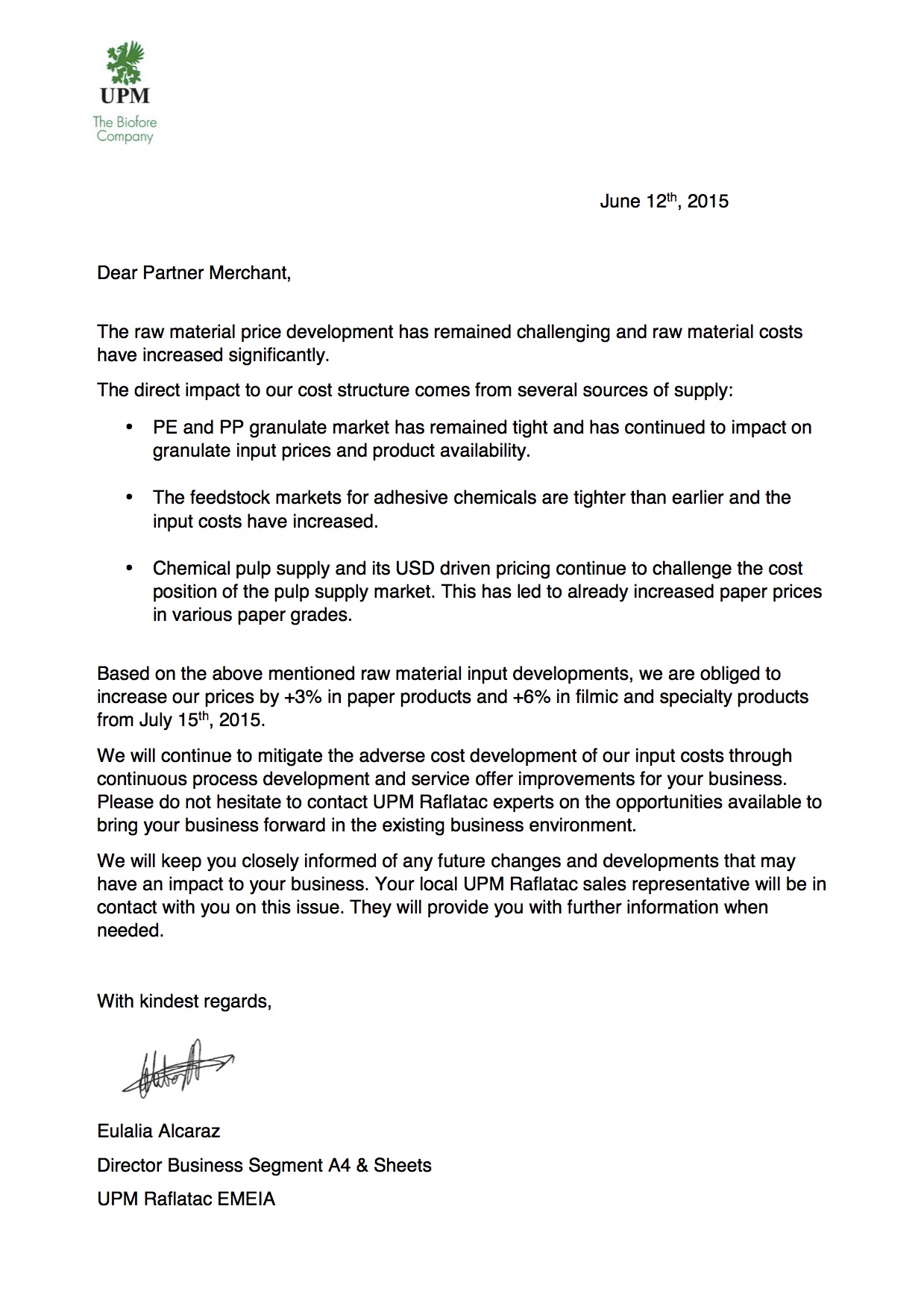 Компания UPM Raflatac повышает цены на 3 - 6 % с 15 июня 2015