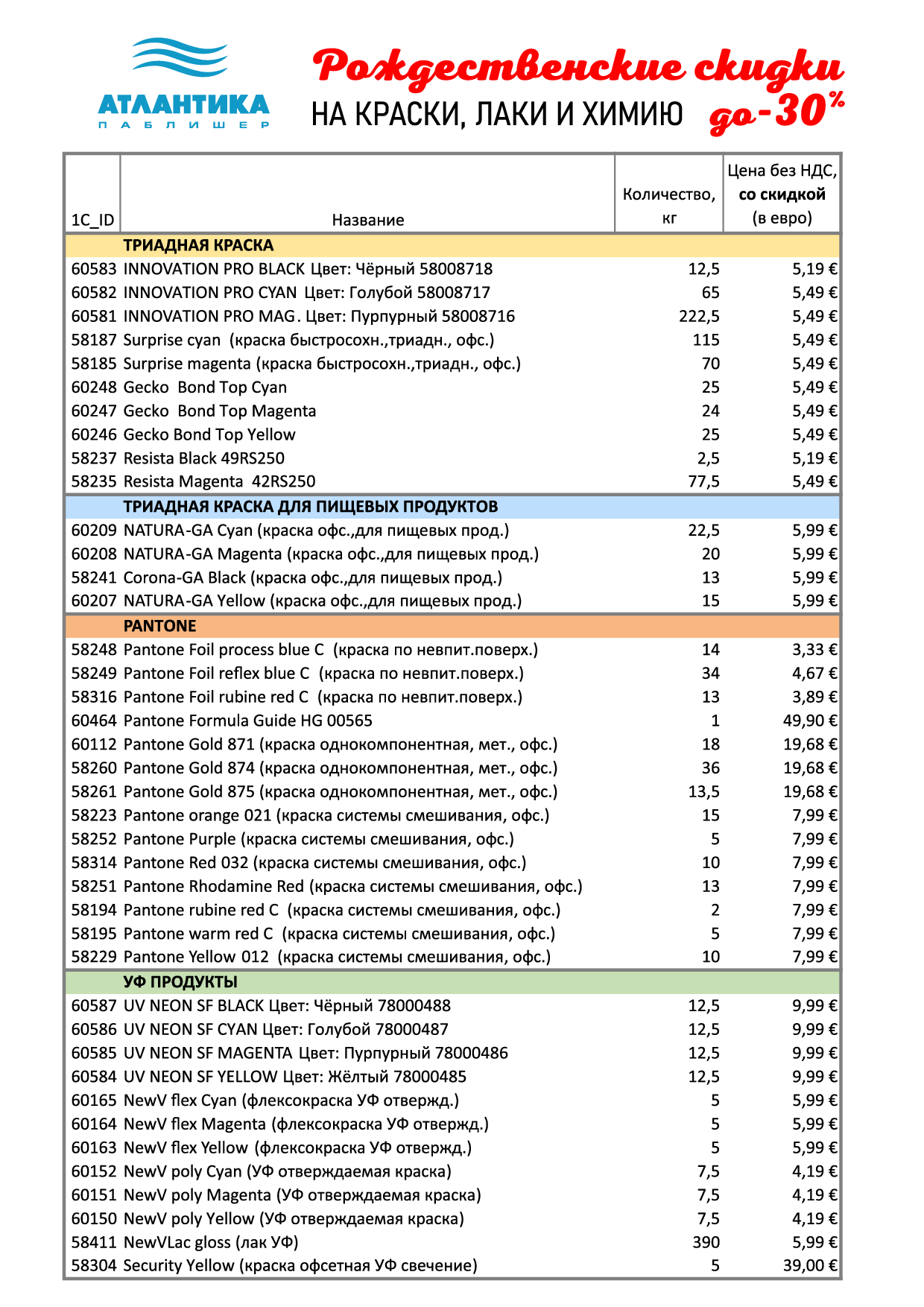 Мы рады сообщить о Рождественской Акции на краски, лаки и химию для полиграфии! Скидки до -30%!